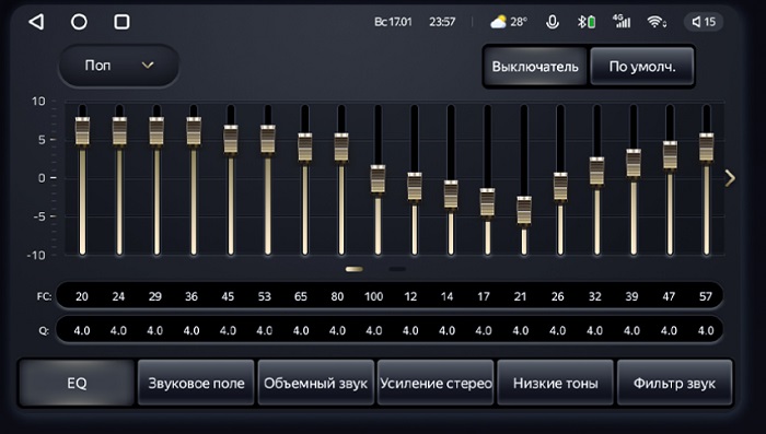 Исключительная обработка звука DSP. 36 - полосная глобальная регулировка эквалайзера в диапазоне от низких частот (20HZ) до высоких частот (20KHZ). Можно выполнить детальную настройку необходимых параметров воспроизведения. Так же можно настроить каждую из 4-х колонок по отдельности и создать такую акустическую среду, какая необходимо именно Вам. Таким образом Вы можете создать эффект присутствия в концертном зале и наслаждаться живым звуком прямо у себя в автомобиле. Усилить басы и отфильтровать высокие частоты тоже не проблема.