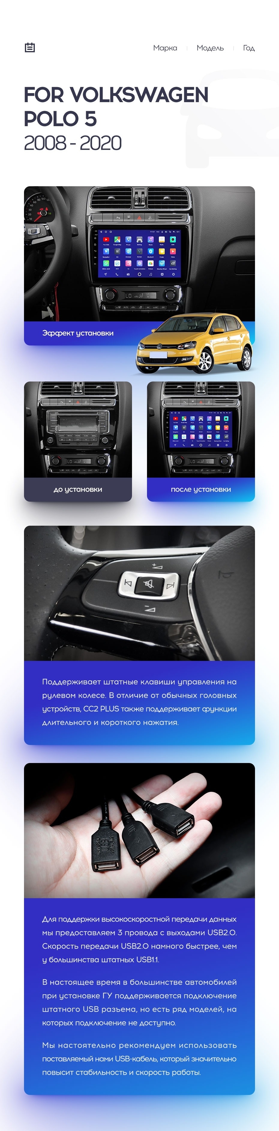 Полный комплект установки магнитолы Teyes с рамкой и проводкой можно выбрать в каталоге штатных магнитол Volkswagen Polo 5 (2008-2020).